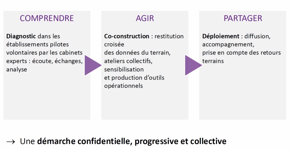 L’approche globale de la démarche de prévention repose sur une phase empirique d’étude et d’analyse sur le terrain, menée auprès d’établissements pilotes volontaires, par des prestataires experts. L’objectif est de produire des outils concrets, mutualisés et pertinents, afin de diffuser une véritable culture commune de prévention et d’inciter les établissements à s’engager dans cette voie. Cette action s’intègre dans le cadre d’un dialogue social renforcé, du pilotage rigoureux assuré par la commission EEP Prévention et est financée par le fonds du DES du régime EEP Santé.