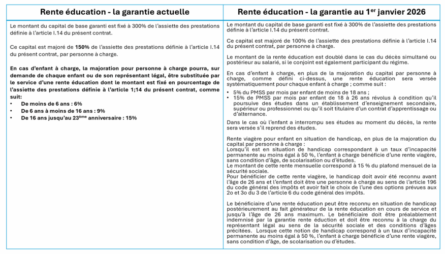 Comment évolue la garantie rente éducation au 1er janvier 2026 ? Voici un tableau comparatif « garantie actuelle versus garantie à venir »: