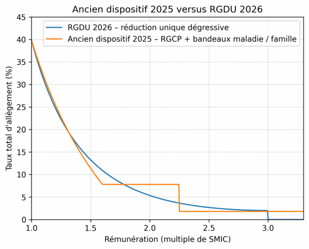 Jusqu’en 2025, les employeurs bénéficiaient d’un dispositif combinant, d’une part, la réduction générale de cotisations patronales (maximale au niveau du Smic et dégressive jusqu’à environ 1,6 Smic) et, d’autre part, des taux réduits sur les cotisations d’assurance maladie et d’allocations familiales, applicables respectivement jusqu’à 2,25 Smic et 3,3 Smic. À compter du 1er janvier 2026, ces taux réduits (« bandeaux ») sont supprimés pour la quasi-totalité des employeurs, au profit d’un mécanisme unifié : la réduction générale dégressive unique (RGDU).